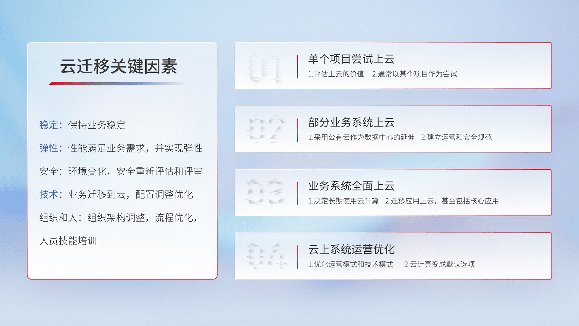 结合实际业务,,,,从规划设计、、云平台选型、、、云原生改造、、、数据迁移、、集成交付,,,迁移全过程为客户识别最佳上云路径,,做好风险识别管理,,,,设计网络架构、、、、身份权限、、、安全审计合规、、、、操作审计、、、、日志审计、、、、监控告警策略、、、、多站点容灾设计等,,,,对云上基础设施进行整体规划,,,提升IT治理水平,,,,以满足弹性、、高可用、、、高性能的需求。。