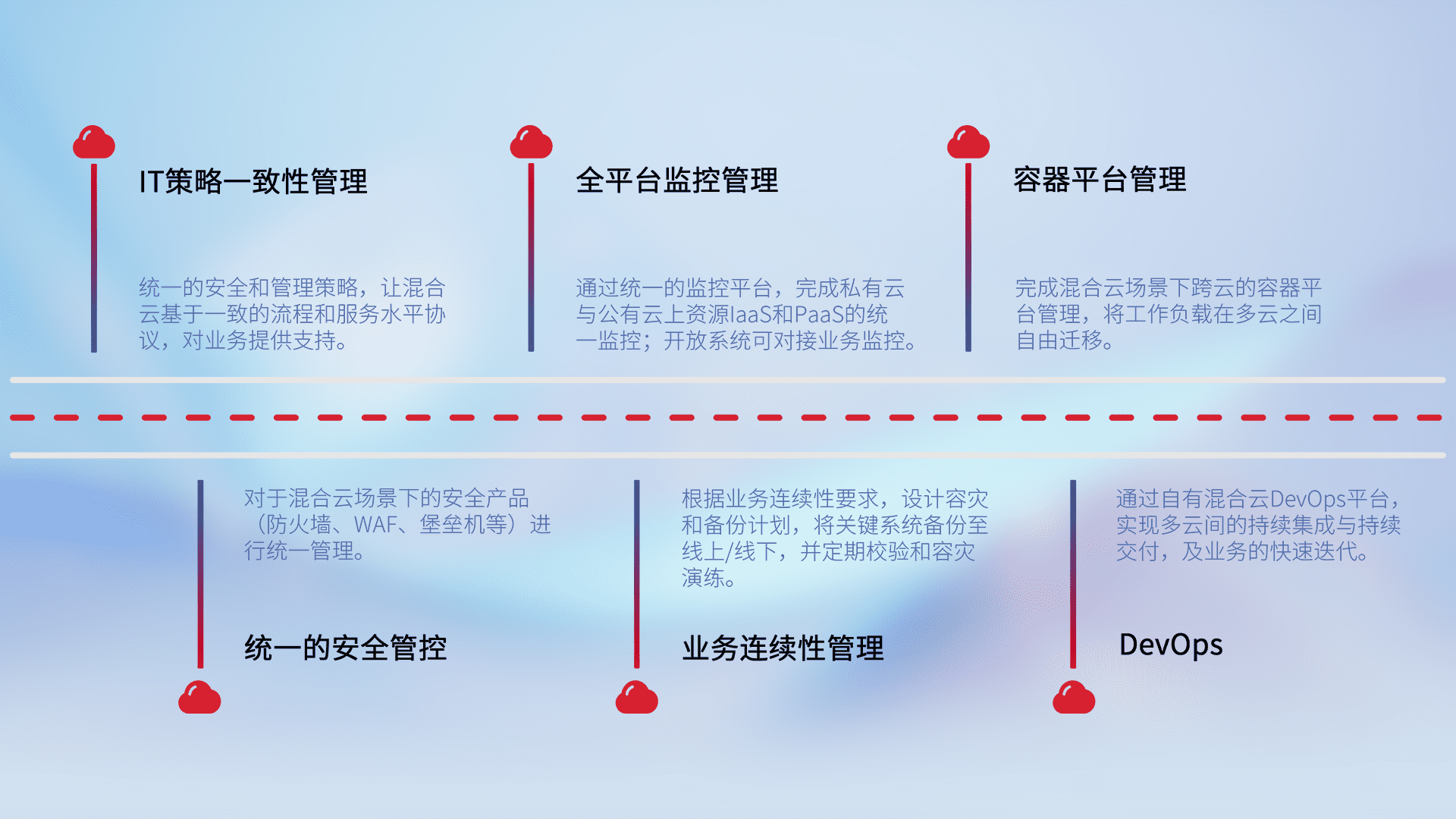 通过多云纳管,,,以统一的资源数据模型把客户的云资源进行抽象和封装,,,,进而实现对多云资源的统一操作,,,,保障云资源管理的可靠性、、、、稳定性与可用性。。量身定制化运维内容,,,配置、、、、开发运维、、、、补丁管理、、、备份、、、监控、、、、认证和访问管理、、、、审计和日常巡检等,,,保障在用云过程中的可靠度,,,,稳定度以及高可用率。。。