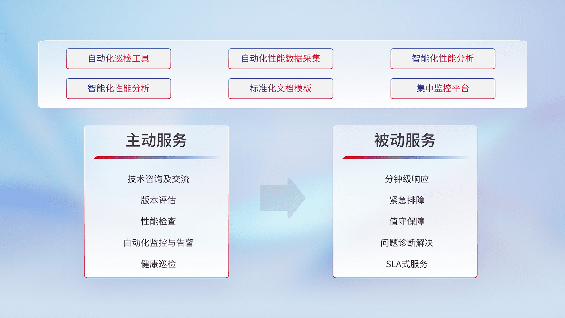 智能化工具和标准化文档,,,,保障服务质量,,,,提供主动服务(包含技术咨询、、版本评估、、、、性能检查、、、、自动化监控与告警、、健康巡检)和被动服务包含(分钟级响应、、、紧急排障、、、、值守保障、、、问题诊断解决、、、、SLA服务)。。