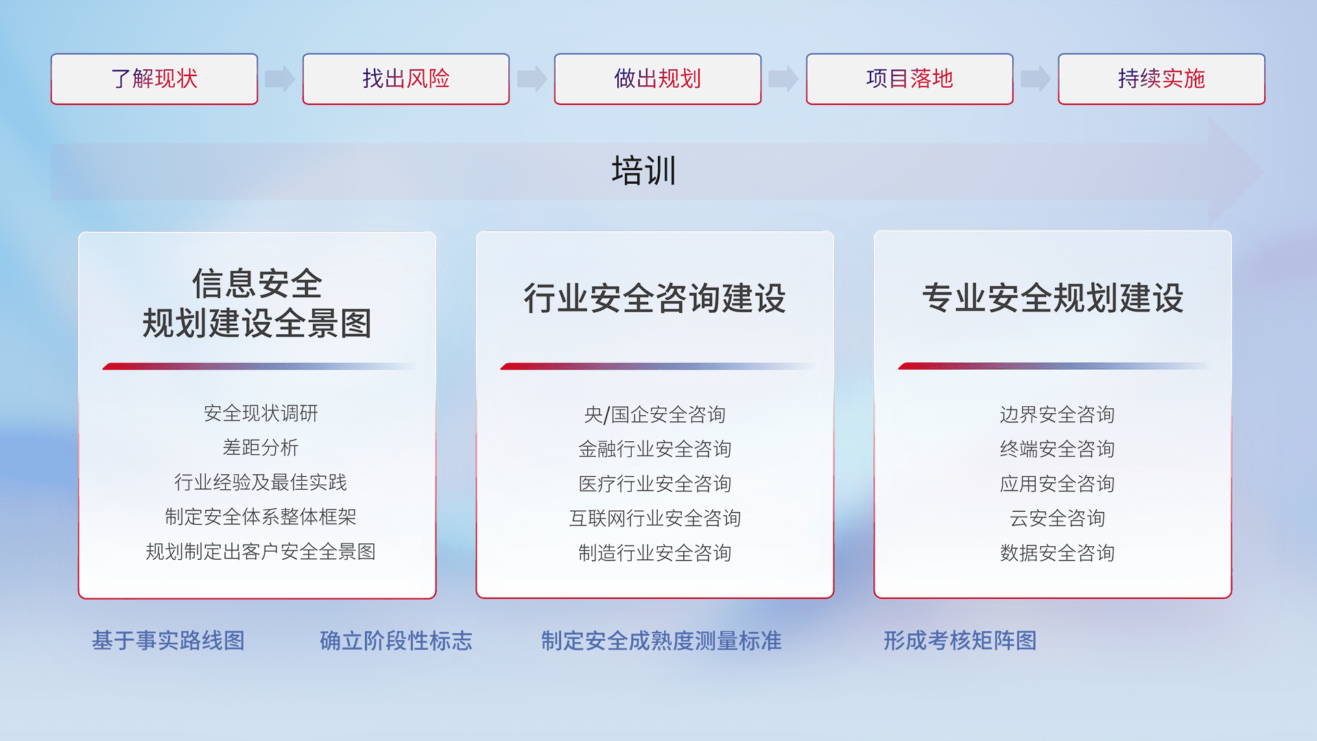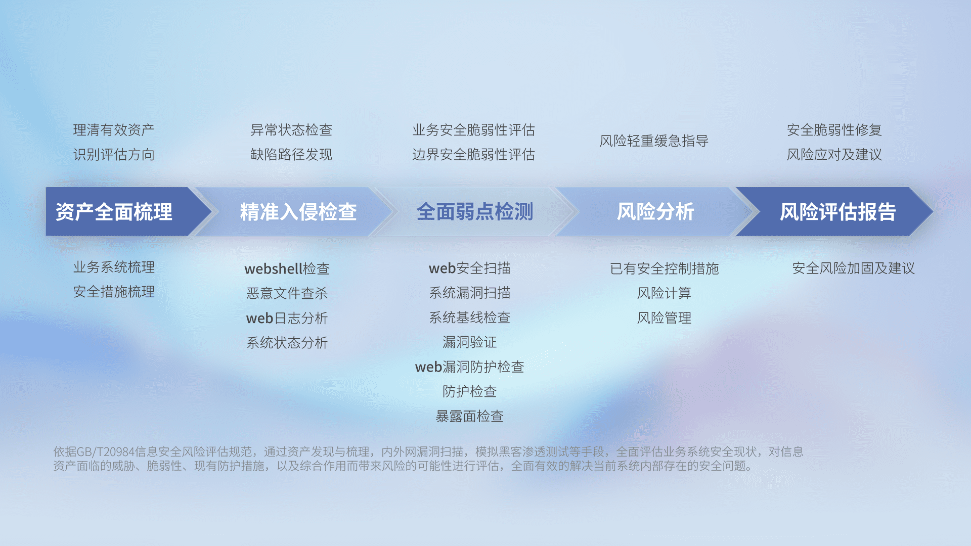 针对客户行业特性,,,,以专业的安全服务+多厂商联合解决方案提供专属的一站式安全管理服务,,,,帮助客户全面感知网络空间威胁,,基于识别、、、检测、、、分析、、、、防护、、监测、、、响应的服务理论模型,,,从方案咨询、、、、集成交付、、、评估验证、、优化加固、、、、运维运营,,致力于为客户提供完整的闭环管理式安全服务。。。。以实战经验为客户打造高抵御风险的安全体系,,,帮助客户发现威胁、、对抗威胁、、处置威胁,,,,不断积累安全对抗能力,,,持续保障数字化安全。。。。